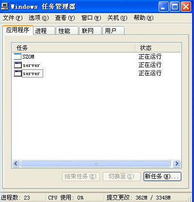 木馬程序或者病毒運(yùn)行而引起的窗口變小的情況,這時(shí)同時(shí)按住 Ctrl+Alt+Del鍵調(diào)出操作系統(tǒng)的“任務(wù)管理器”,我們會(huì)發(fā)現(xiàn)除了“SZOM”的軟件外還有其他的運(yùn)行程序。